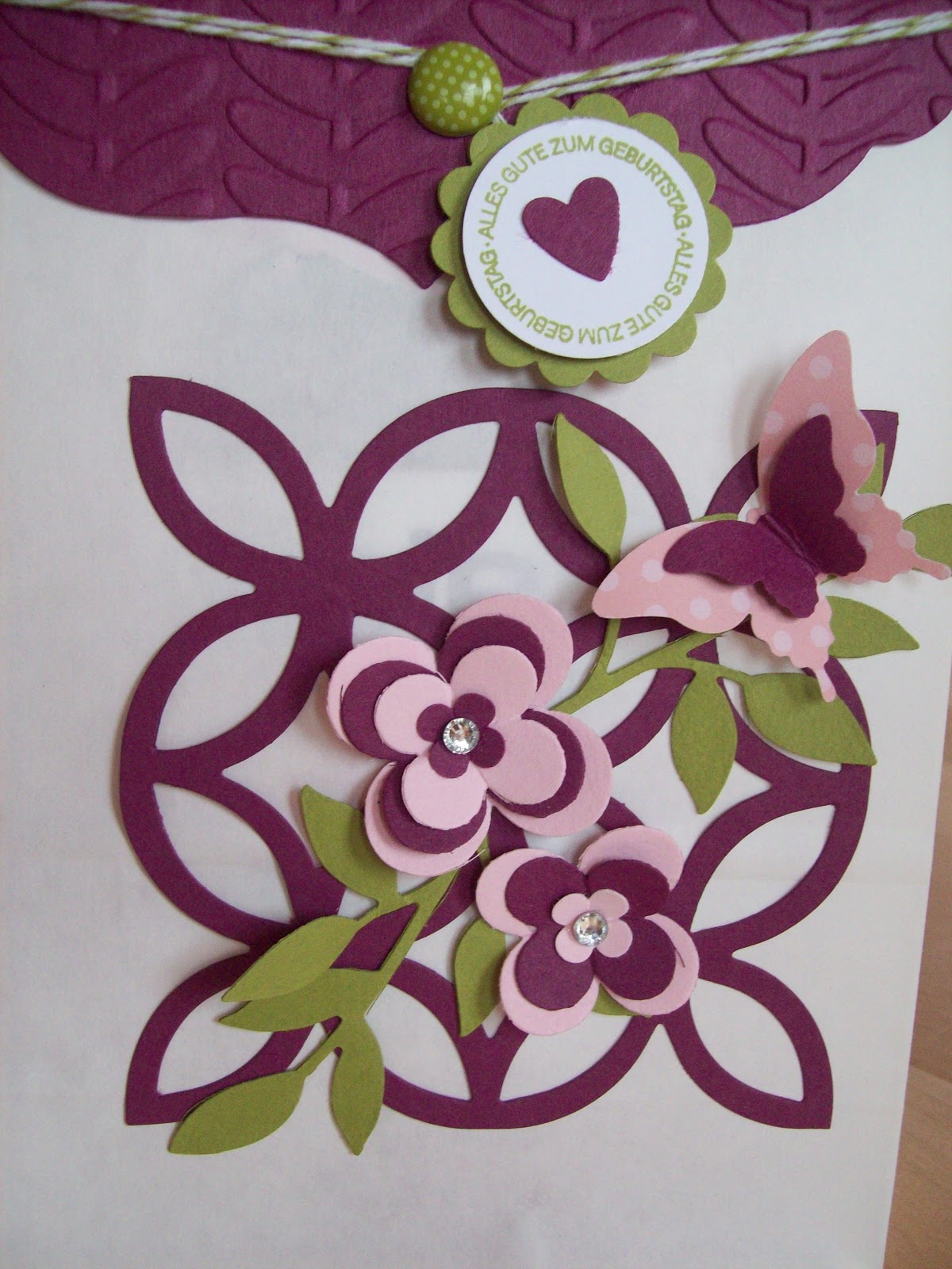 Nach anfänglicher Skepsis überzeugt mich das "Elegante Gitter" zwischenzeitlich restlos und es macht riesig Spaß damit zu arbeiten. Auch die Sizzlits Stanze "Blumentrio" ist zu empfehlen, zusammen mit der dazu passenden kleinen Stanze aus dem Stanzenpaket "Itty Bitty Formen" lassen sich schöne Blütenkreationen (hier noch mit dem "zarten Zweig" und den tollen Schmetterlingsstanzen) fertigen.