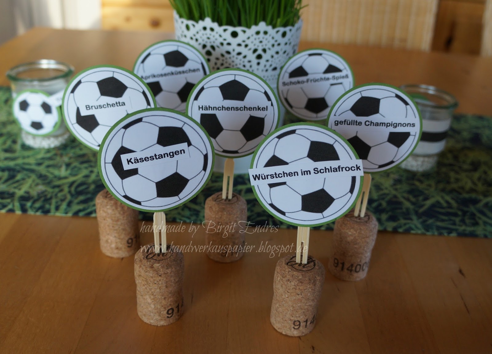 Morgen schlagen die Herzen aller Fußballfans wieder höher, denn dann beginnt die Europameisterschaft in Frankreich. Das Tochterkind Nr. 2 hat morgen seine Projektprüfung im Fach Soziales. In der praktischen Prüfung wird gekocht und als Thema ist "Fingerfood" vorgegeben. Die vierköpfige Mädelsgruppe hat sich passenderweise zur Eröffnung der Euro als Dekothema "Fußball" ausgesucht. Bei der Aufgabenverteilung stand auch gleich fest, wer für den Punkt "Deko" verantwortlich sein wird. Richtig, natürlich das Fräulein E., denn sie hat bereits bei den Übungsprojekten (mit Mamas Hilfe) für ansprechende Tischdeko gesorgt. Also haben wir uns gestern die Details überlegt und heute ging es dann ans Basteln. Heute Abend haben wir mal zur Probe gedeckt (da es ja ein Büffet gibt, stehen die Teller natürlich nicht auf dem Tisch) .............